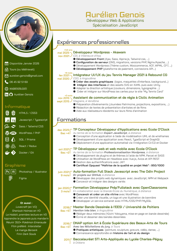 Après des études en Arts Appliqués puis aux Beaux-arts et un master en Bande Dessinée, j’ai décidé d’apprendre les langages informatiques pour appliquer mes compétences en design graphique dans le domaine du numérique.